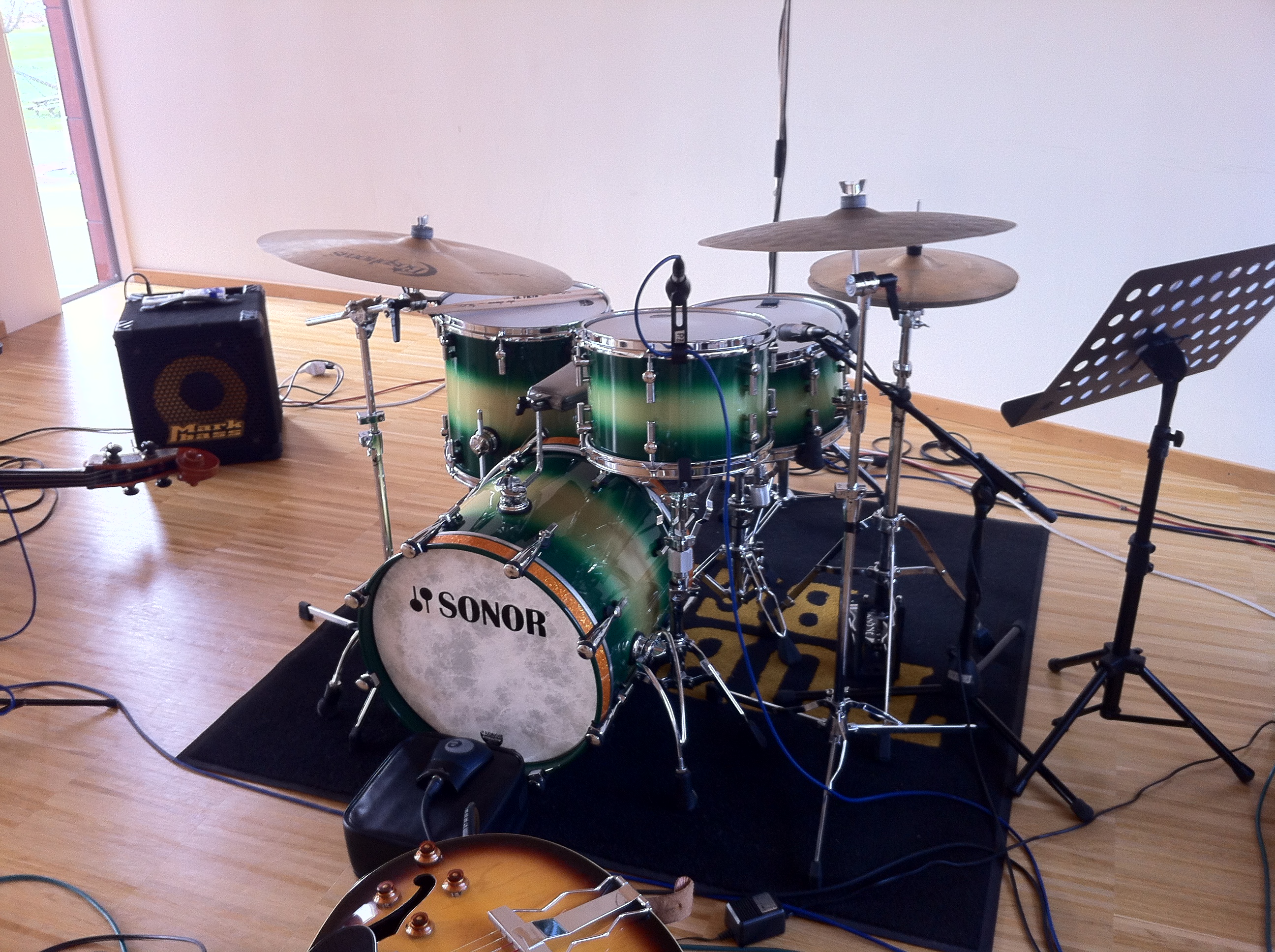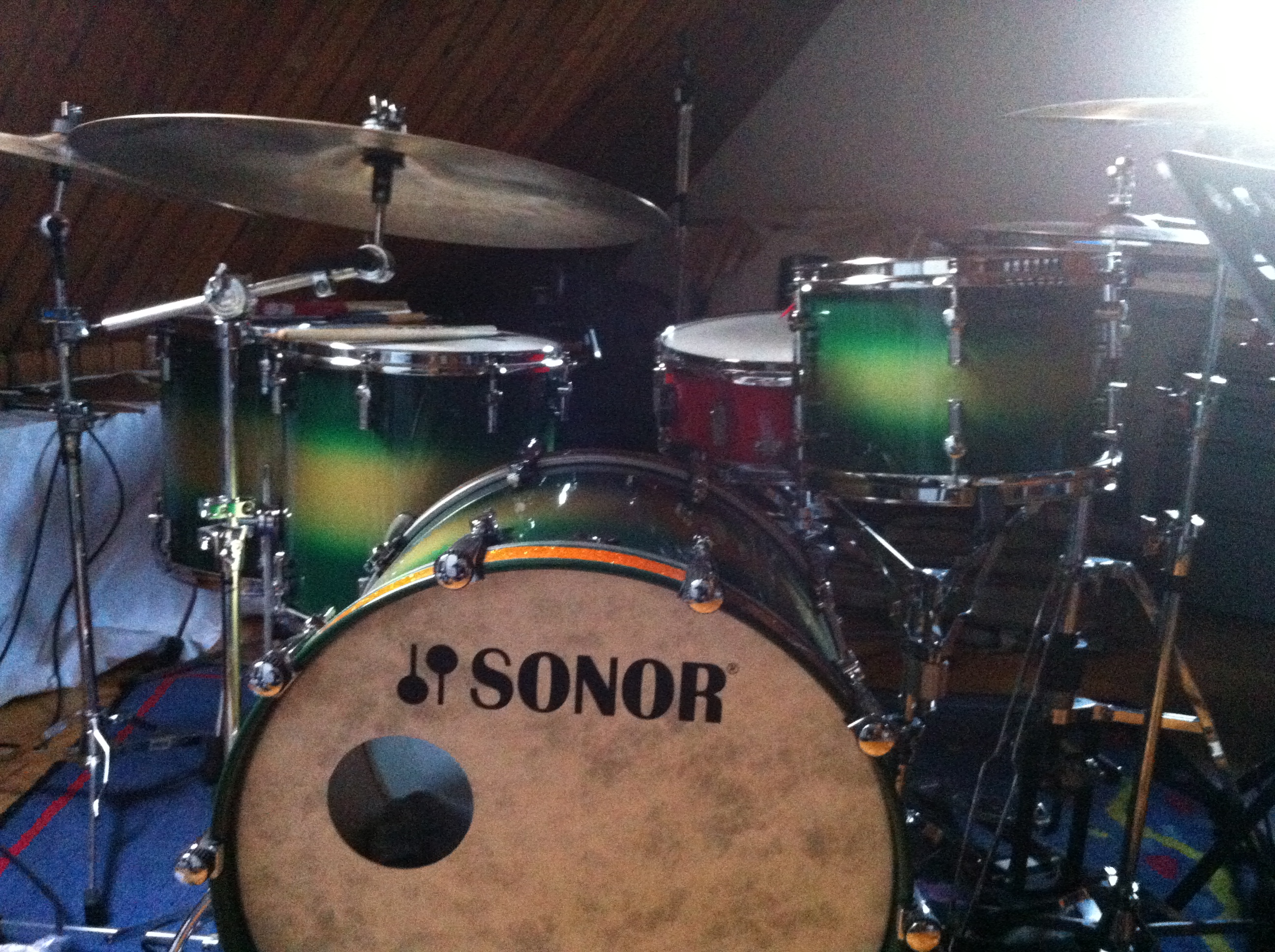 custom duco green over gold finish with orange sparkle bass drum hoop inlays